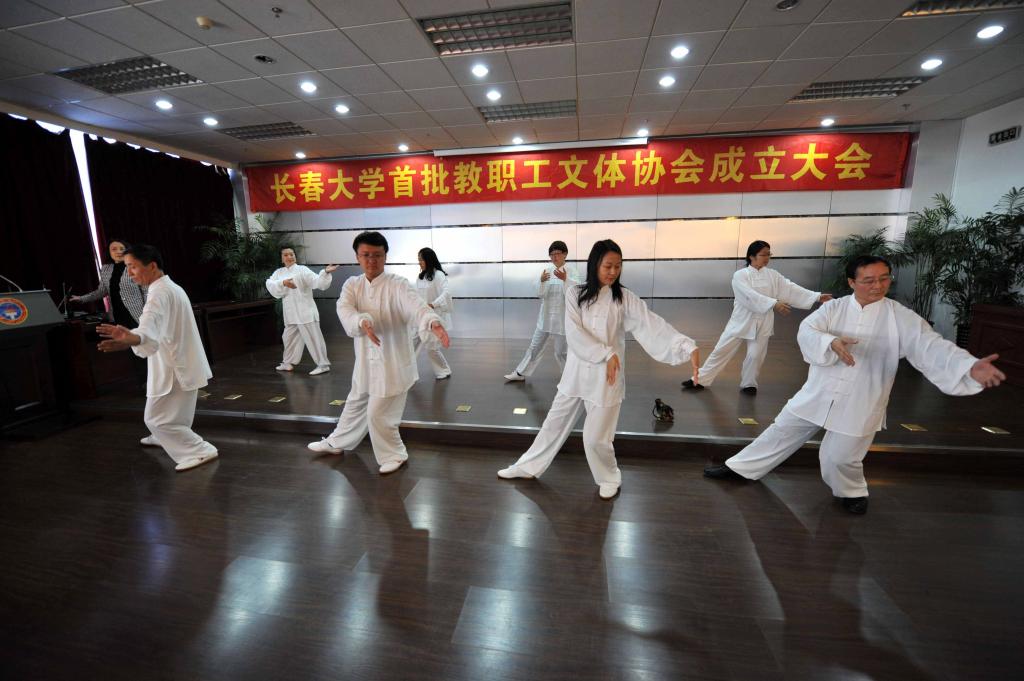 会上,工会副主席隋力力宣读了学校同意成立长春大学首批文体协会的决定;党委副书记靳国庆为六个单项文体协会授旗,羽毛球协会会长吕中华、篮球协会会长王一、乒乓球协会会长由剑锋、徒步协会会长魏立强、武术健身协会会长高立波、舞蹈健身协会副会长邵皖霞代表各协会接旗,活动现场气氛热烈、情绪高昂,武术健身协会在会长高立波带领下进行了精彩的太极拳表演。